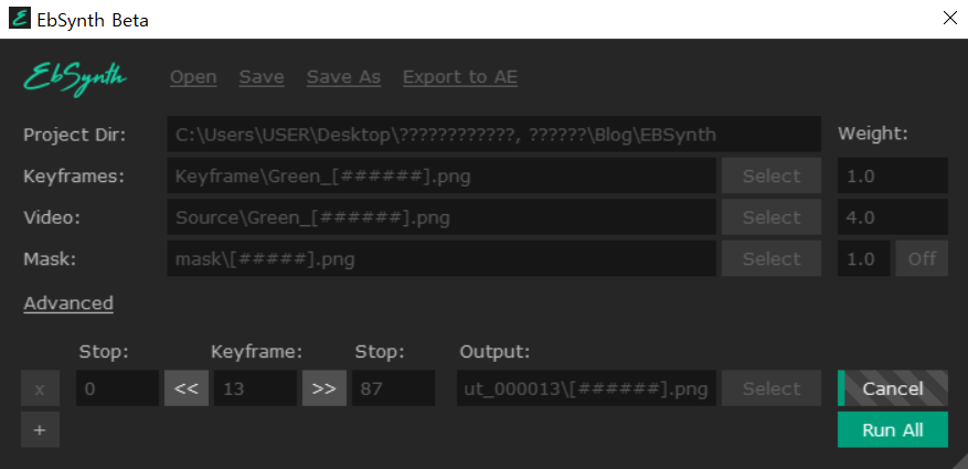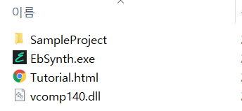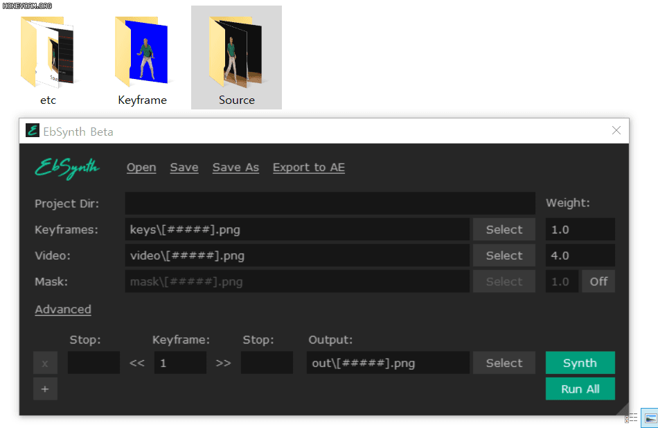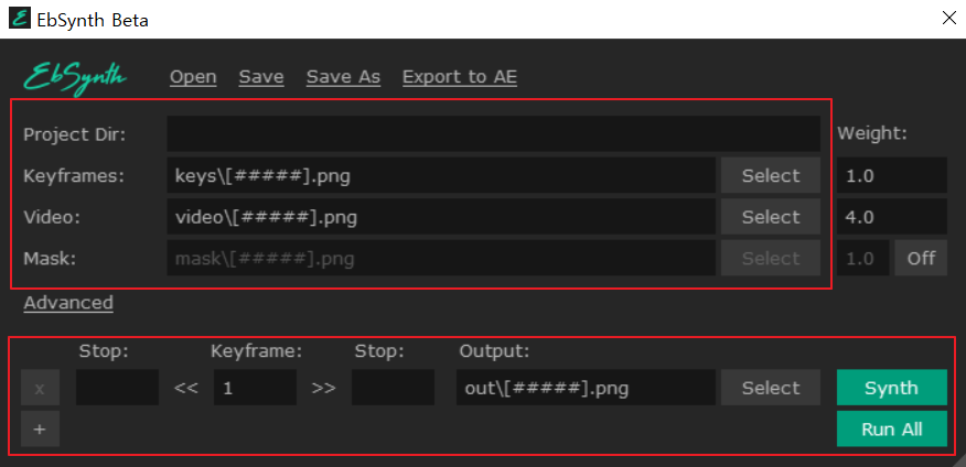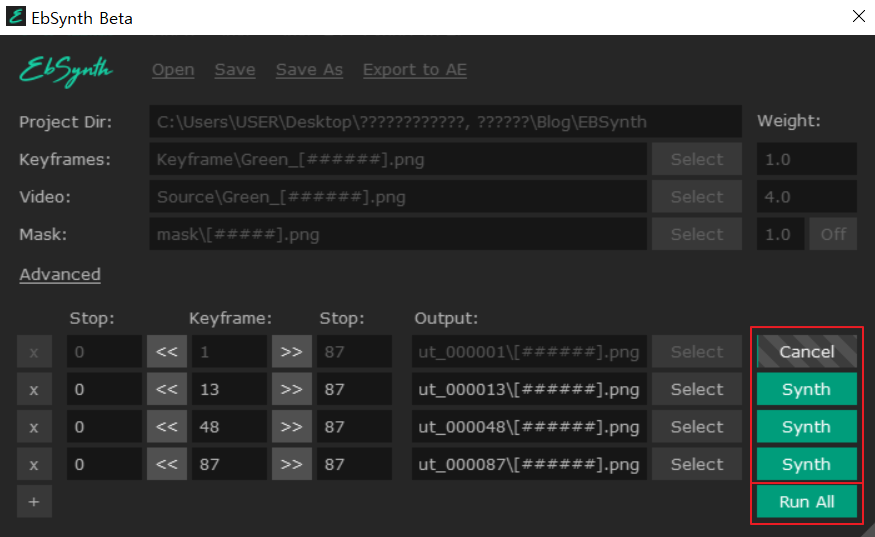 그 후 EBSynth.exe를 엽니다. 프로그램은 두 부분으로 구성되어이있는데, 윗부분에는 소재를 넣고, 아랫부분에서는 구간을 정한 후 렌더링을 할 수 있습니다.