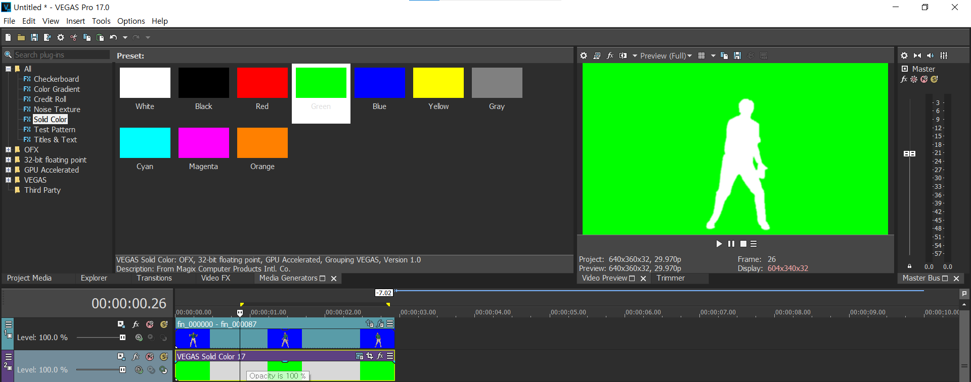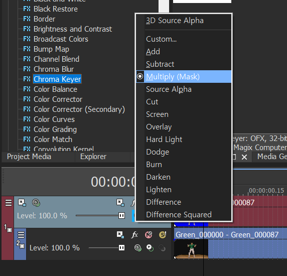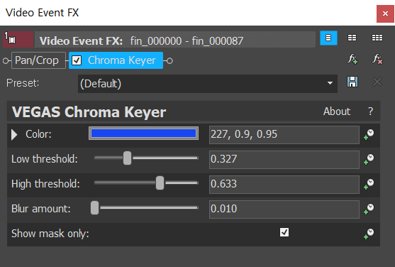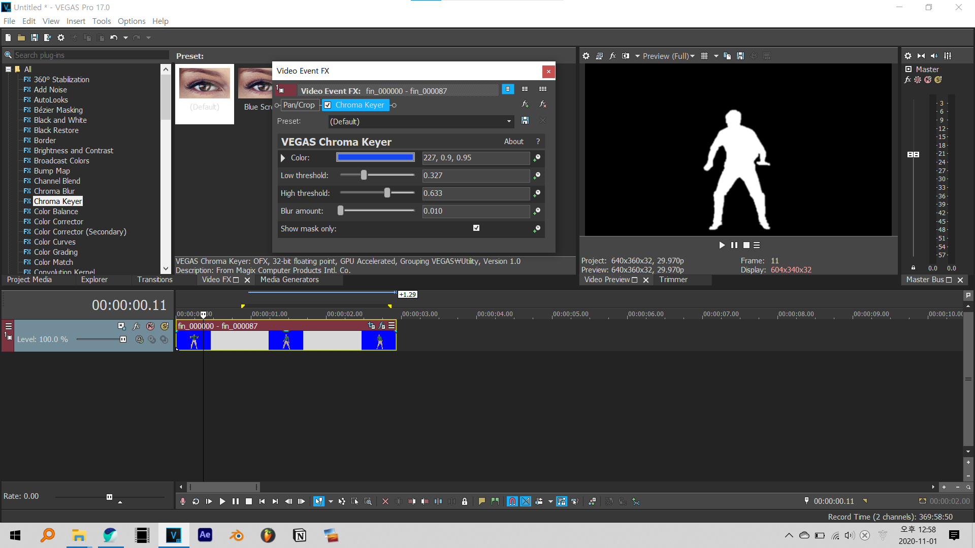 우선 EBSynth에서 만들어 둔 클립을 트랙에 넣은 다음 Video fx에서 배경색에 따라서 적절한 Chroma Keyer라는 효과를 적용해주세요. 그리고 Low threshhold 값을 올리고 High threshold값을 내려서 배경을 깔끔하게 제거해주고, Show mask only를 체크해서 다음과 같이 배경이 제거된 영상이 흰색으로 나타나게 해주세요. 원한다면 Blur amount를 조절해서 테두리를 약간 부드럽게 만들어 줄 수 도 있습니다.