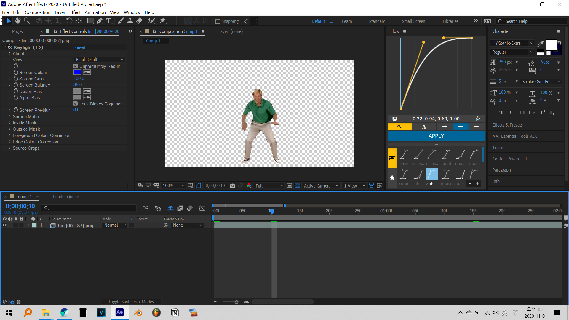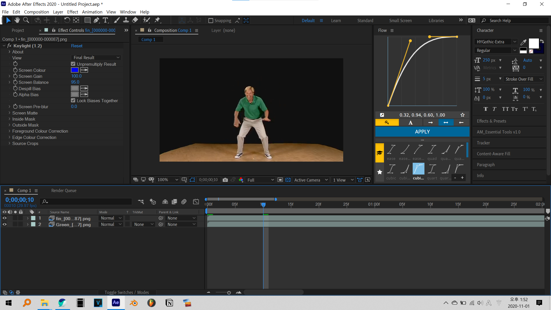 우선 EBSynth영상을 새 컴포지션에 넣어준 다음 Keylight나 Color key같은 효과를 넣어서 크로마키 처리를 해줍니다.