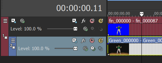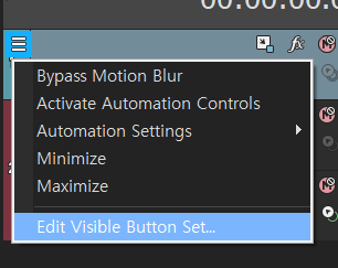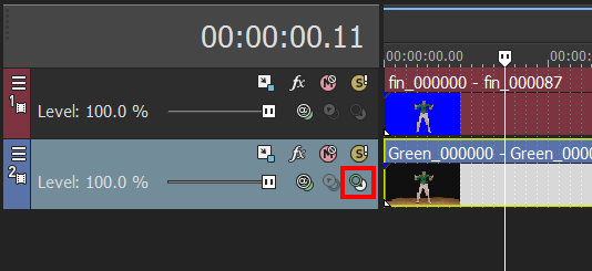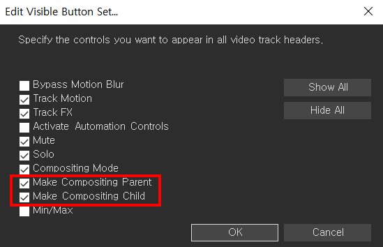 만약 이 아이콘이 안 보인다면 트랙 왼쪽 상단의 세줄짜리 직사각형 아이콘 클릭 > Edit Visible Button Set...을 클릭한 다음 나오는 창에서 Make Compositing Parent와 Make Compositing Child를 체크한 후 OK를 누르면 됩니다. (베가스 17 기준입니다.)