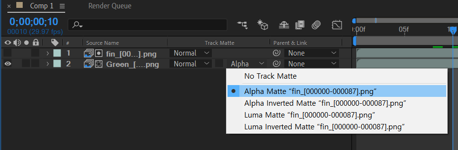그리고 EBSynth레이어 밑에 원본 영상을 넣어준 다음 원본영상의 Track Matte항목을 Alpha Matte로 설정합니다. 이때 Track Mat te항목이 안 보이는 분들은 프로그램 하단 부분의 Toggle Switches/Modes 아이콘을 클릭해서 Track Matte를 보이게 설정할 수 있습니다.