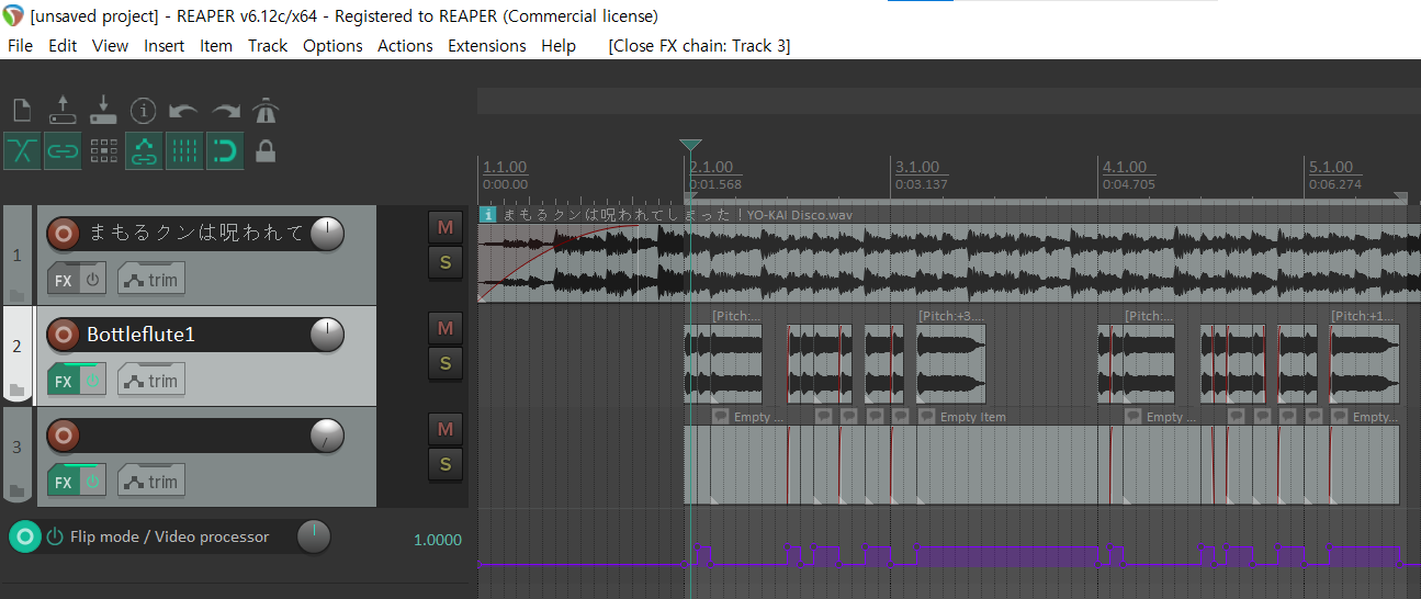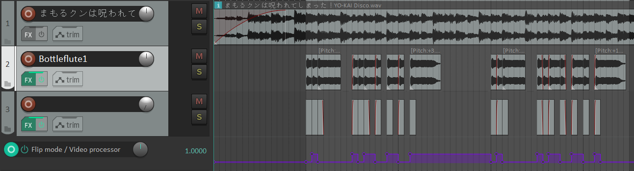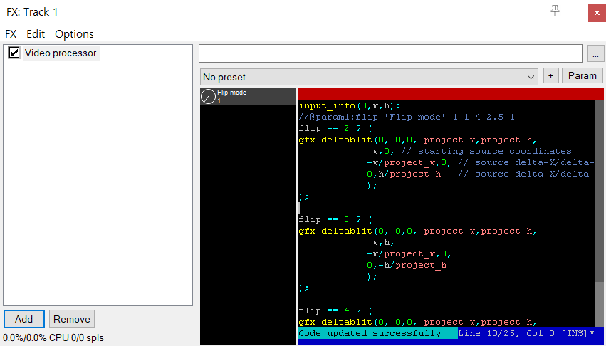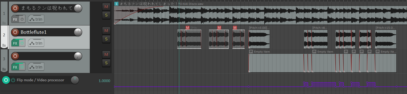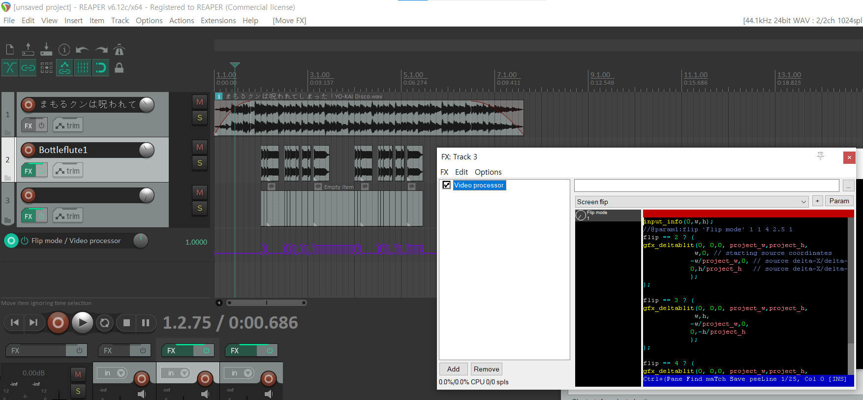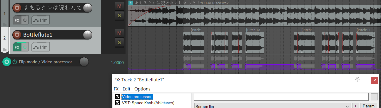 Mode 2 : Mode 0, 1과 달리 새로운 트랙을 생성하지 않고 트랙 자체에 좌우반전 효과를 넣어줍니다. 이때 Video processor 트랙의 모든 효과들 앞에 삽입됩니다. 원래는 midi2item 스크립트 같은 경우를 대비해 만들었는데, 제가 그거에 관해서 아직 글을 안 써서 이에 대해서는 추후에 다뤄볼 예정입니다.