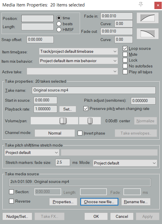 그런 다음 새로운 트랙에 있는 Empty item들을 모두 선택한 다음 F2키를 눌러서 설정창을 열어줍니다. 그런 다음 설정창 하단의 Choose New File에서 자신이 원하는 동영상을 선택해줍니다. 저는 아래 영상과 같이 미리 확대 효과를 준 영상을 넣어 주었습니다.3