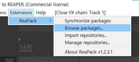 우선 스크립트를 다운 받기 위해서 ReaPack라는 플러그인을 설치해 줍니다. 이전에 제가 올린 포스트의 "다운로드"문단을 참고해서 ReaPack을 설치해줍니다. 정상적으로 설치되었다면 리퍼를 재가동 했을 때 상단에 새로 생긴 Extensions 메뉴를 클릭해보면 ReaPack이 보일 겁니다.