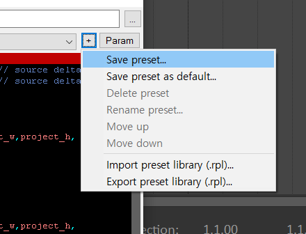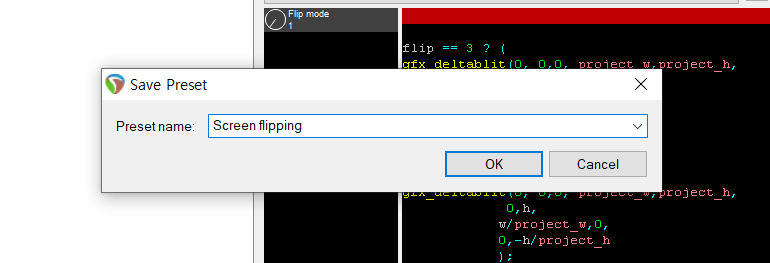 그 후 우측 상단의 +모양 버튼을 눌러준 후, Save preset을 선택하고 Screen flip이라는 이름으로 프리셋을 만들어 줍니다. 이때 철자를 틀리면 이후의 과정이 제대로 진행되지 않을 수 있으니 주의해주세요.