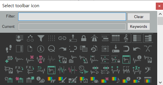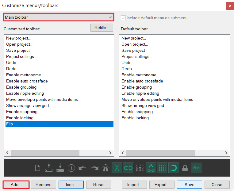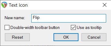 그렇게 아까 띄웠던 창의 왼쪽에 새 스크립트가 추가된 걸 확인 했다면 그 스크립트를 선택한 후, Icon 버튼을 클릭해서 메인 툴바에 어떤 아이콘의 모습으로 스크립트를 띄울 건지 또한 설정할 수 있습니다. 이때 Change icon을 선택하면 리퍼에서 기본적으로 제공해주는 아이콘들중 하나를 선택할 수 있으며 (두번째 사진), Text icon을 선택하면 글자로 아이콘이 바뀌게 됩니다(세번째 사진). 저는 Text icon을 선택한 뒤 Flip이라는 이름으로 아이콘을 바꿨습니다.