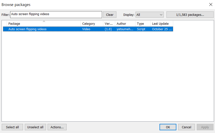 그렇게 Actions창이 열리면 그 창의 Filter부분에서 Auto screen flipping videos를 검색해 준 뒤, 하단의 Select/close를 선택해서 메인 툴바에 해당 스크립트를 추가해줍니다.