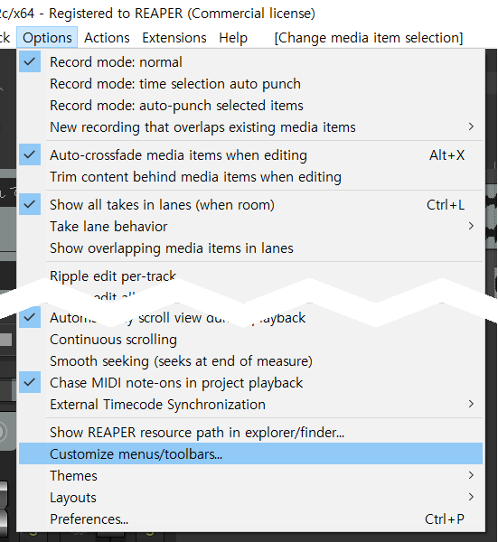마지막으로, 일일히 앞에서 설명한 방법대로 스크립트를 작동시키는게 귀찮을 때, 리퍼 좌측 상단의 메인 툴바에 바로가기를 추가해서 사용하는 방법도 설명하겠습니다. 우선 Options > Customize menus/toolbars로 들어가줍니다.