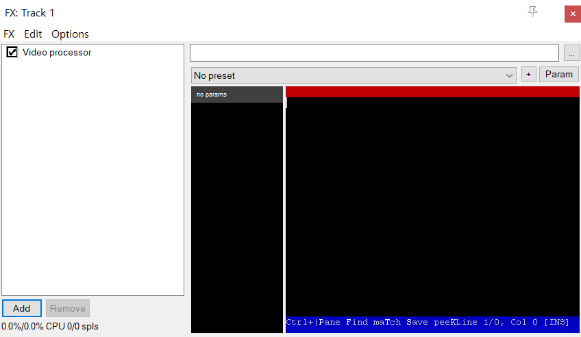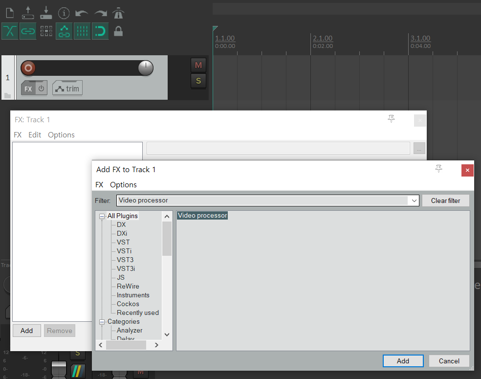 우선 리퍼에 있는 비디오 편집 효과에 제가 만든 좌우반전 프리셋을 넣어주도록 하겠습니다. Ctrl + T로 새로운 트랙을 만든 후에 FX버튼을 클릭해서 효과 창을 띄웁니다. 그런 다음 Video processor효과를 검색해서 트랙에 해당 효과를 넣어줍니다.