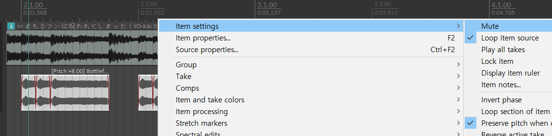 또한, 좌우반전을 원하지 않는 아이템들이 있을 때는 아이템들을 Shift + 클릭이나, Ctrl + 클릭으로 다중 선택한 후 아이템 우클릭 > Item settings > Mute를 설정해 아이템을 뮤트 시켜놓으면 좌우반전의 대상에서 제외됩니다.